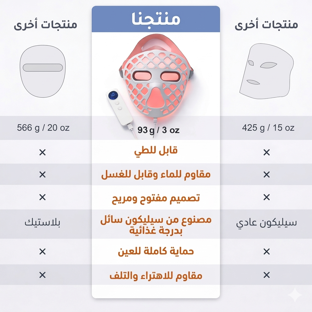 على عكس الأقنعة المسطحة، يحافظ التصميم ثلاثي الأبعاد على مسافة مدروسة بين الضوء والبشرة، ما يساعد على توزيع أفضل للضوء مع راحة وتهوية أعلى أثناء الاستخدام.